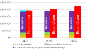 Last year our income (the multi coloured bar on the chart below) was £193,000. Core expenditure (the red bar in the chart) was £192,000. We balanced the books thanks to the generosity of people who gave to the Mend the Gap campaign (the bright blue bit). But we cannot do that every year. We need our income to come in much more steadily through the year.