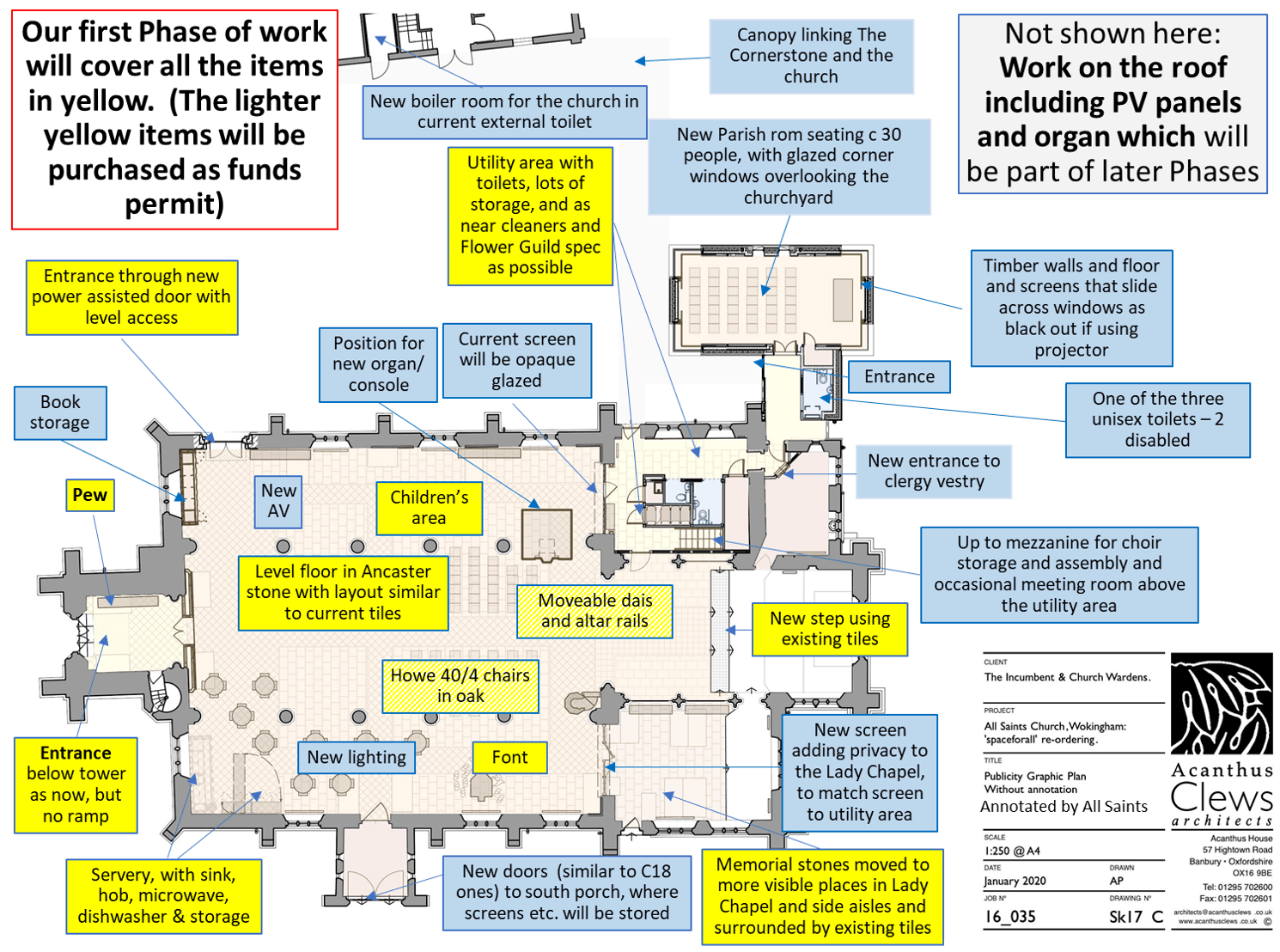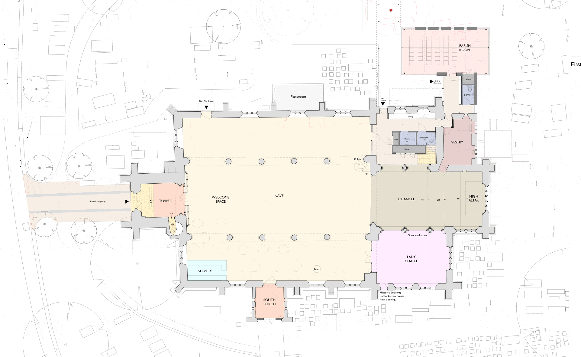 - Essential elements of the church refurbishment to provide the community space, including new floor and heating, utility area and mezzanine, servery and toilets, and the north door. These are shown in yellow on the plan.