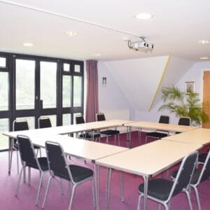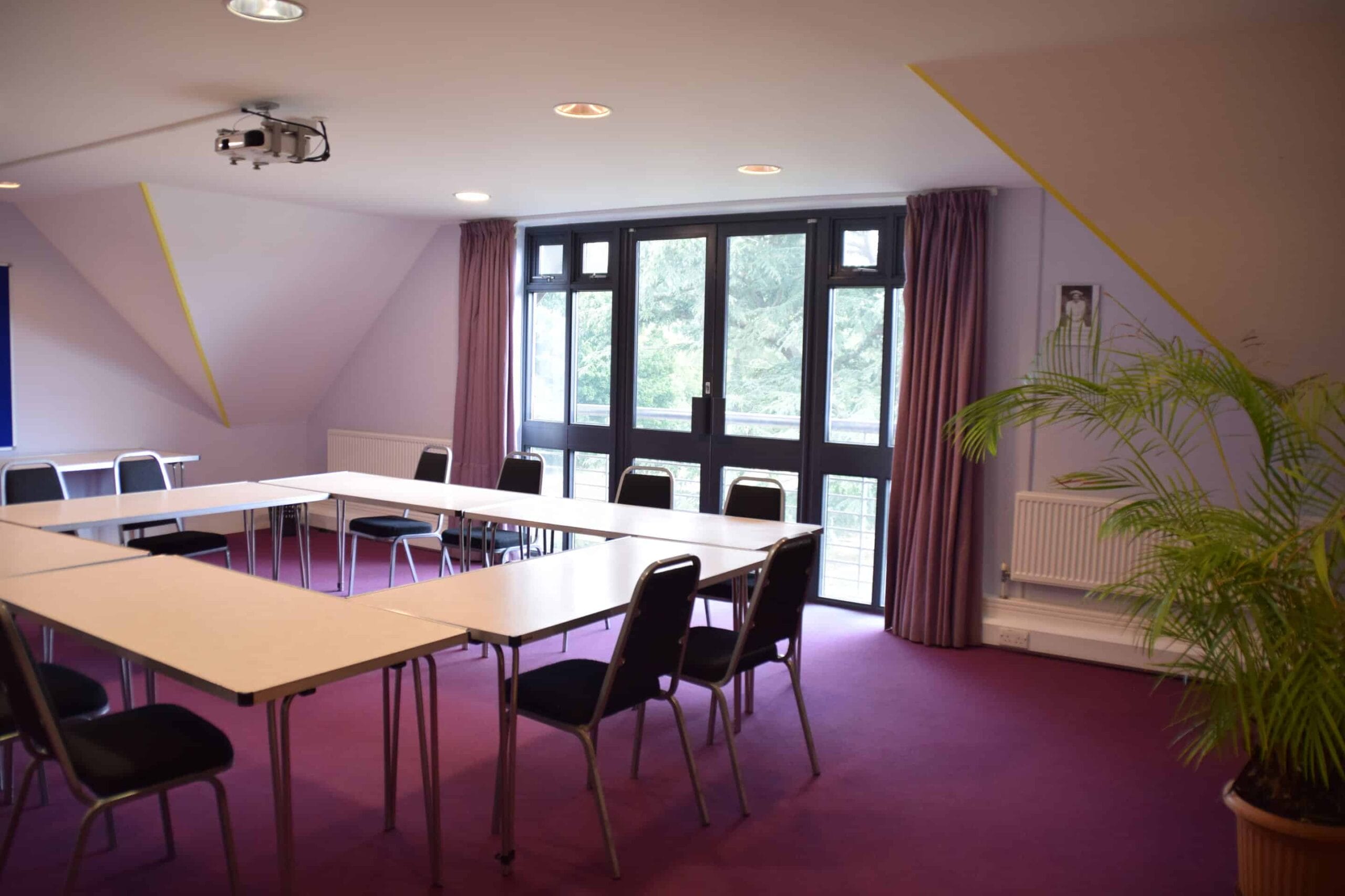 This room is on the first floor, with views over the churchyard and a Juliette balcony. It is carpeting and can be set up in a variety of ways. The de Vitre room accommodates 30 people or so in a well-facilitated carpeted meeting room. This really attractive meeting room is greatly enhanced by the wonderful views from the large windows over the churchyard and its trees.