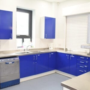 The entrance hall is designed to present a cheery and attractive to all visitors to the Cornerstone. Several art works are on display here and throughout the building which significantly enhance the overall atmosphere. Adjacent to the entrance hall is the office. The window hatch enables our staff to catch anyone coming into the building who is uncertain of their destination room and to give them advice. - First-Floor Kitchenette