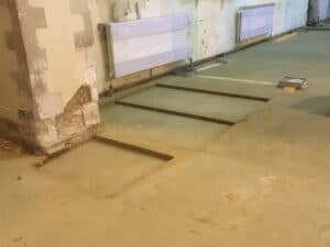 The screed is now complete. It was not an entirely straightforward job. The memorial stones to be re-laid in the church as well as all being different sizes are also different thicknesses. Although the mortar they are laid on can provide some tolerance not all the spaces into which they will be put can be the same depth. The screed layers therefore had to follow an intricate plan with all the dimensions to ensure that when the stones are placed in their final positions the floor will be entirely level.