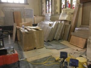 That pile of kitchen units on the lady Chapel has now grown – it has been supplemented with all the oak panelling that will separate the chancel and utility area.