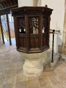 The pulpit has been cleaned and looks really good – but we are still waiting for a piece of stone to repair the bottom step and one upright to the rail.