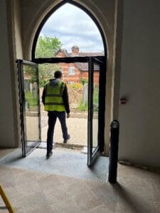 Pictures this week are all evidence of the ending – the cabins being moved, new lighting at the main entrance, and the accessible door working at last – and this was not a contractor walking through – but a member of the staff of the Red Cross to whom we are talking about how they may use the building. And the very best evidence of the end of the work, a view of the Lady Chapel after very detailed attention by our working party last week.