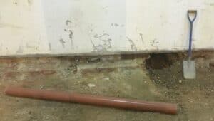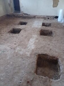 Sometimes construction is a bit prosaic, and this progress report is about things in the ground. There is a new picture of the area surrounding the vault in the chancel which has how been cleared to put the capping stone to protect it (above), and one of the holes to be filled with concrete for the foundations of the steel frame (right) and one of the drain for the font (left).