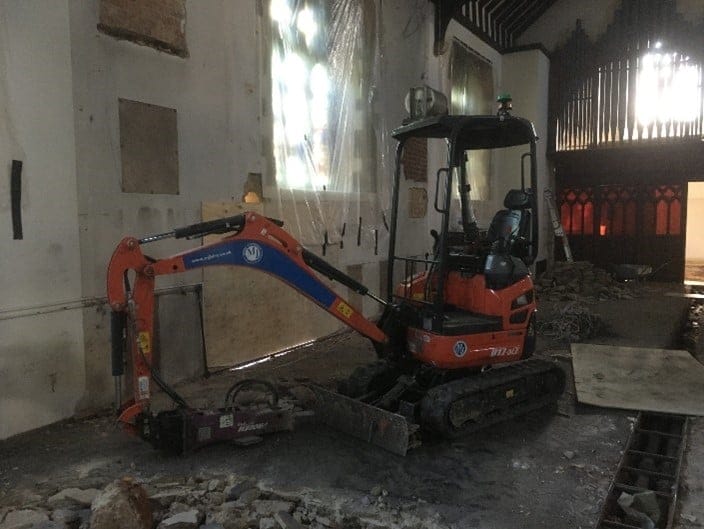 Real demolition has begun in earnest with the concrete slab now being broken up. The waste is then taken in a very small dumper truck to the very big waste container on the Cornerstone driveway. Special care will be taken not to dig too close to the pillars but elsewhere the door needs to be 340 mm deep to accommodate a layer of limecrete in which the underfloor heating pipes will run and then above that a shallow screed and finally the Ancaster limestone floor itself. The top surface will be at the same level as before.